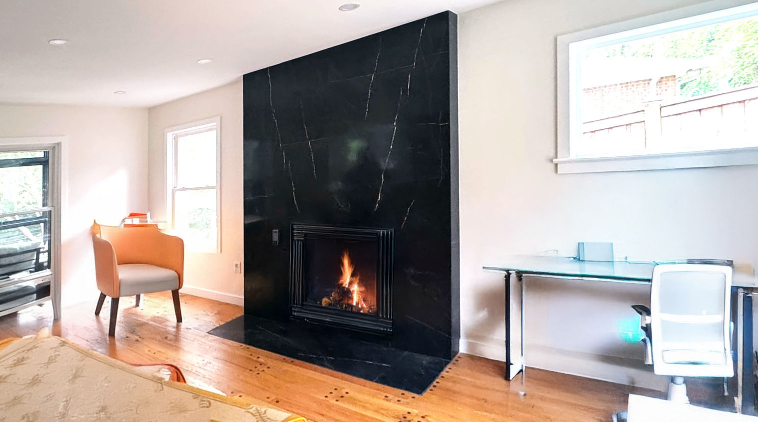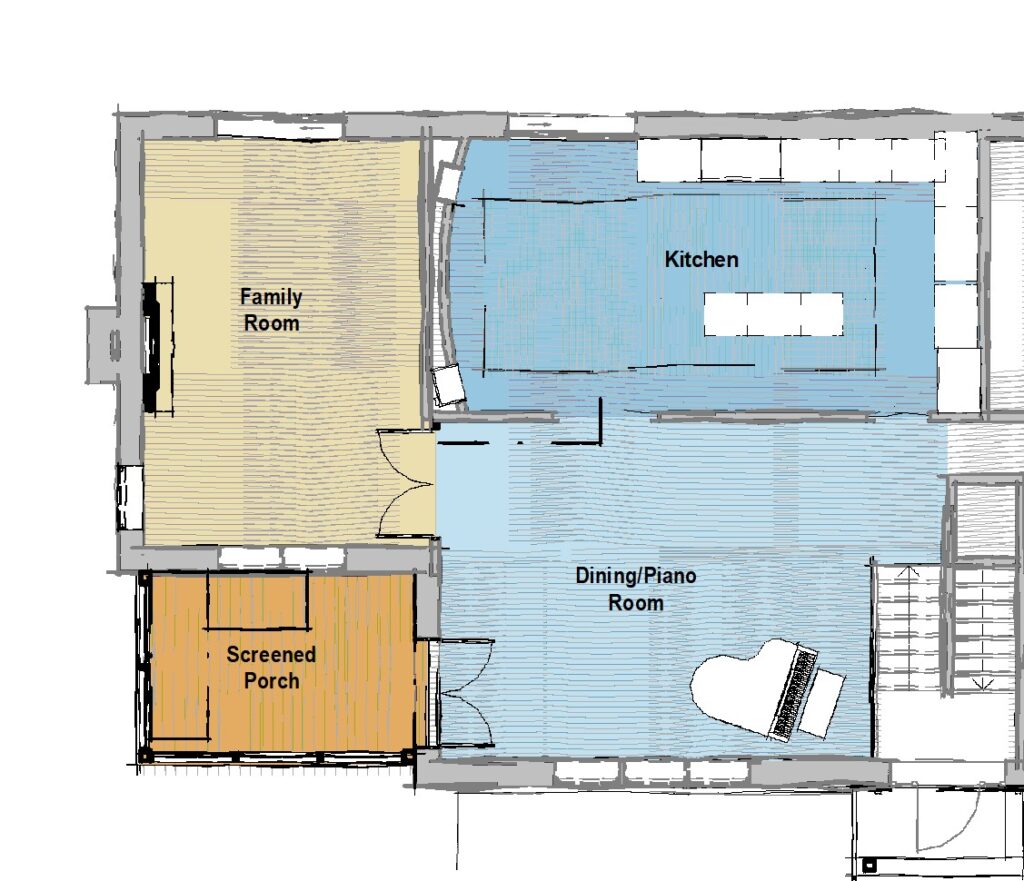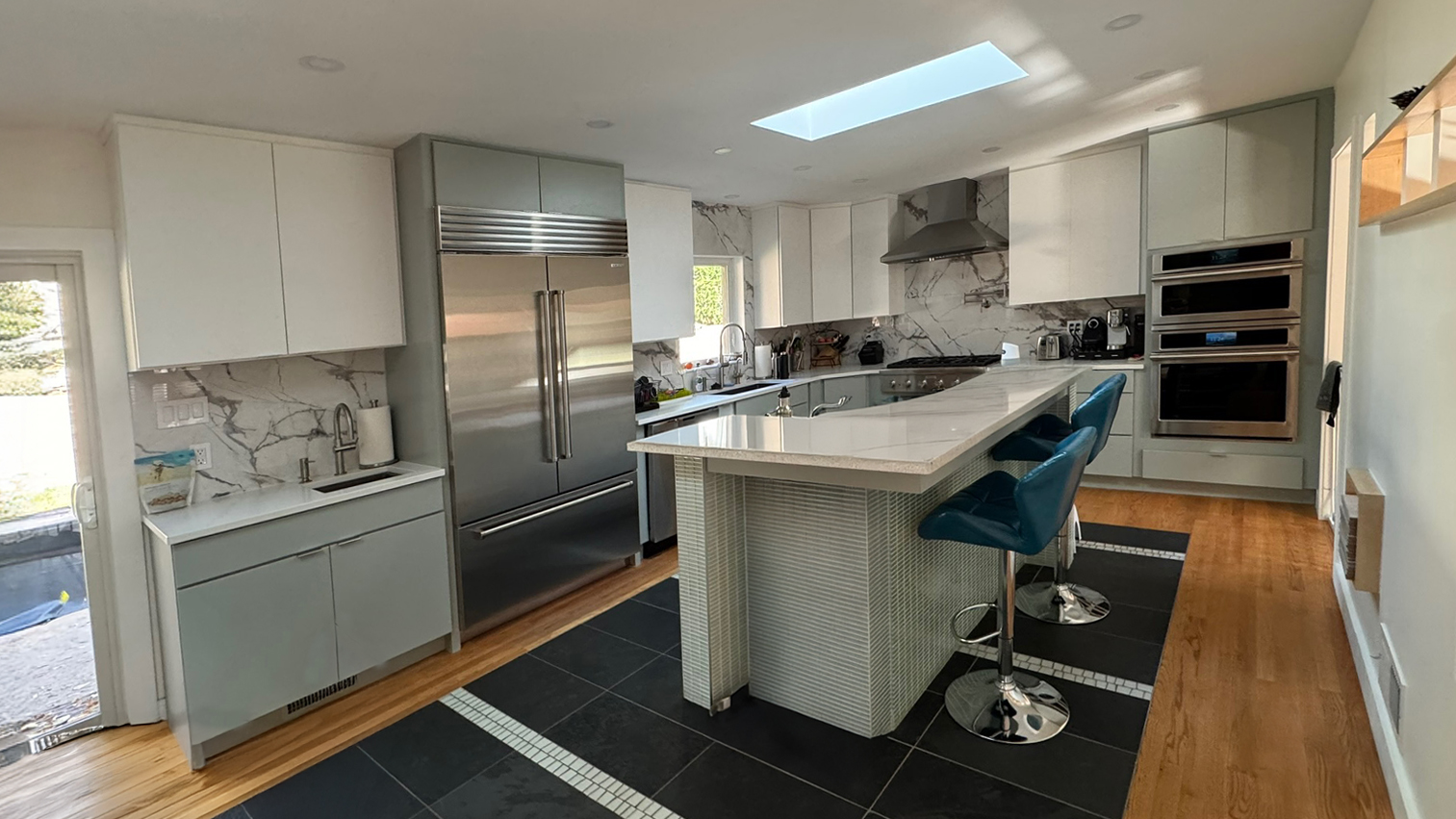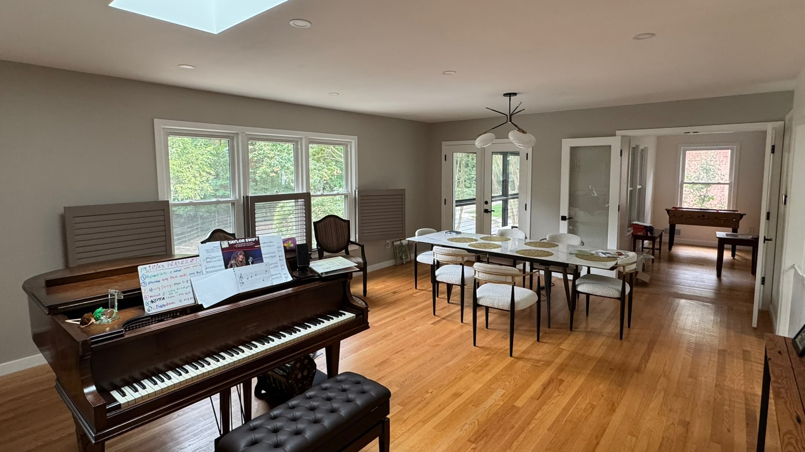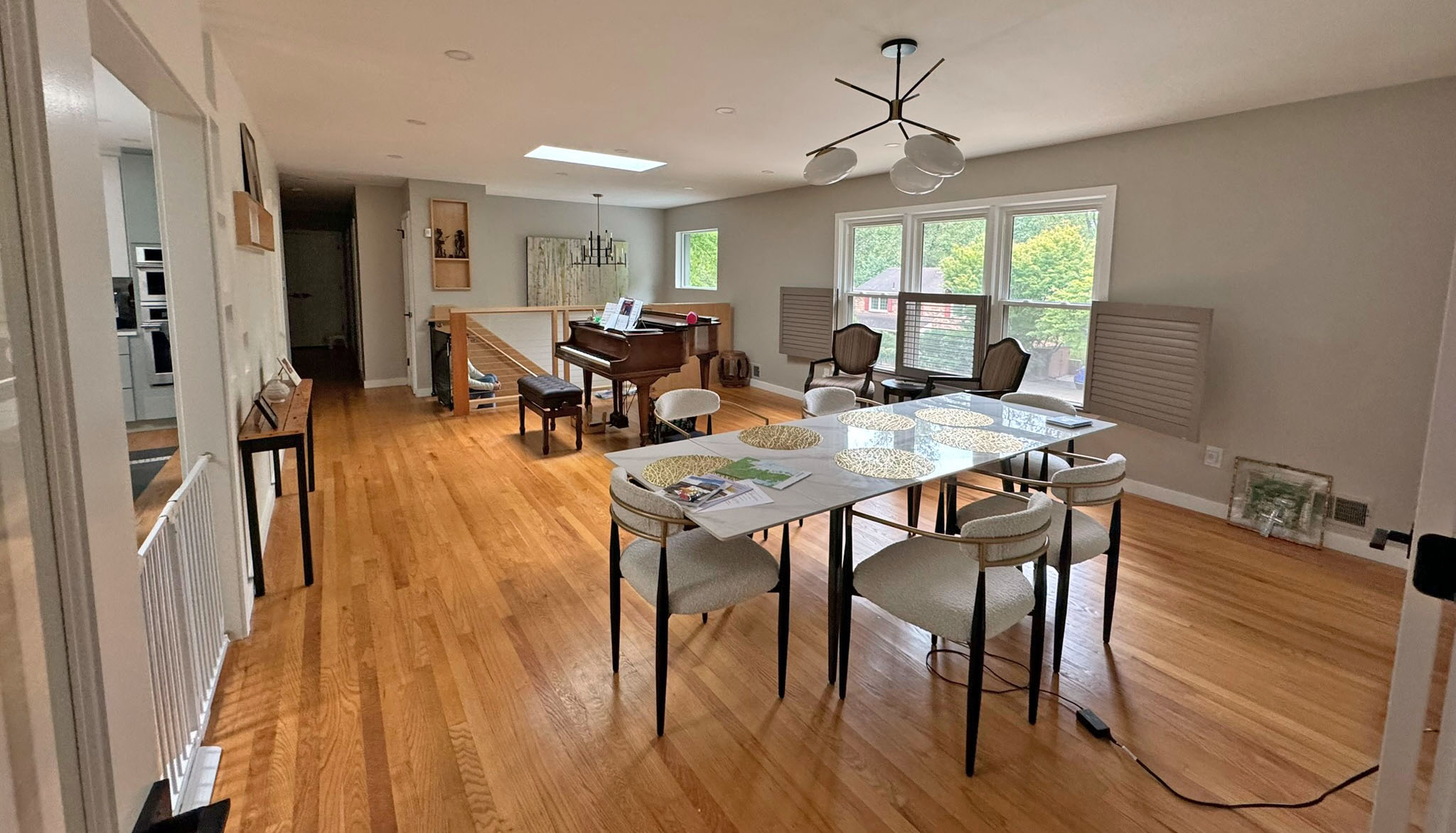 We introduced a new dining and piano room, refreshed the kitchen using the original green island as inspiration for a modern two-tone palette, and infused natural light through new skylights and windows in the family room. A reimagined fireplace with a porcelain slab surround now anchors the space with elegance and texture.