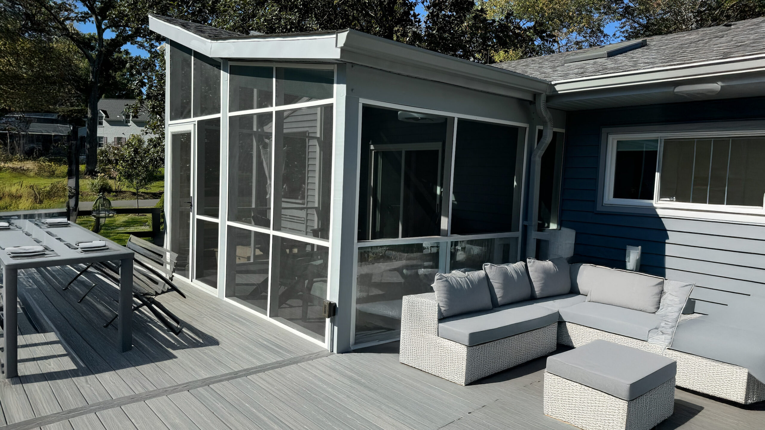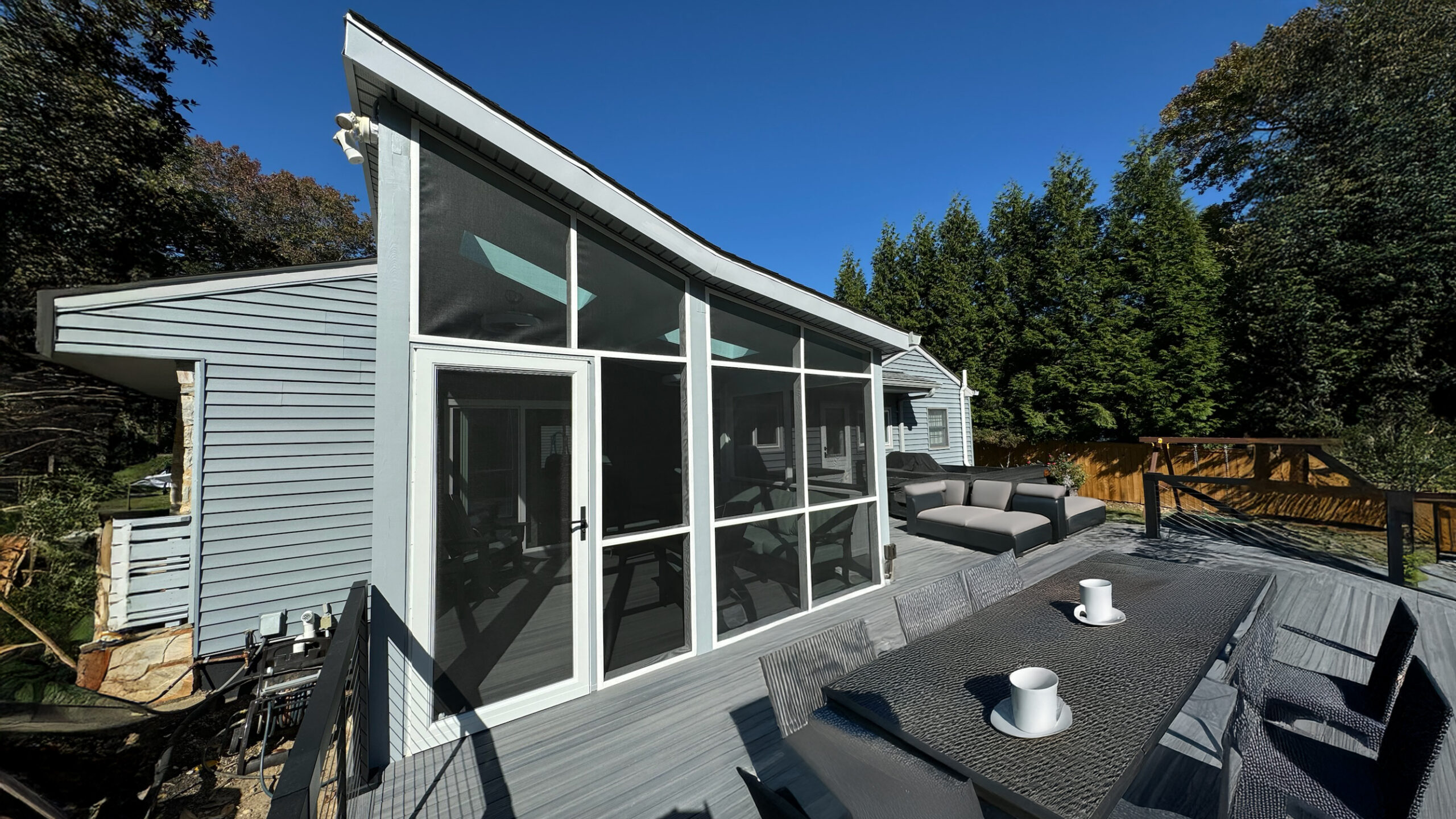 The existing deck provided space but lacked comfort and character. Through a thoughtful structural assessment and creative redesign, we transformed it into a modern screened porch seamlessly integrated with the home’s architecture. Following the roofline’s pitch, we introduced a soaring ceiling with skylights, infusing the space with natural light and openness.